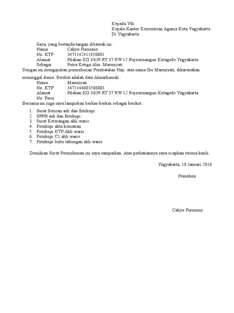 Kemenag memutuskan membatalkan keberangkatan haji 1442 h/2021 m. Surat permohonan pembatalan bermaterai rp.6,000 dari ahli waris atau kuasa waris . Contoh surat pembatalan haji ke kementrian agama by cahyo9purnomo.